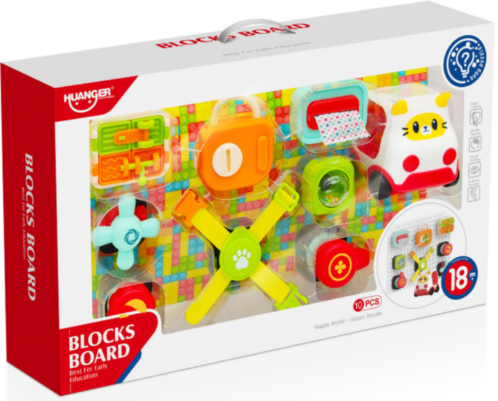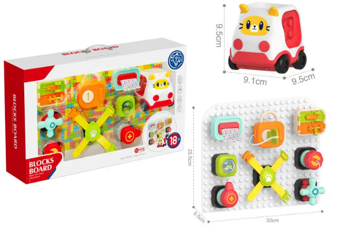 Setul include o mașinuță drăguță și un panou cu 8 elemente diferite care pot fi conectate și aranjate după preferințe.