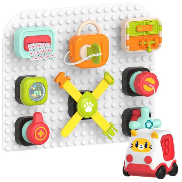 Acest panou senzorial multifuncțional oferă copiilor o gamă variată de activități interactive pentru a-și dezvolta abilitățile motrice fine, coordonarea și imaginația.
