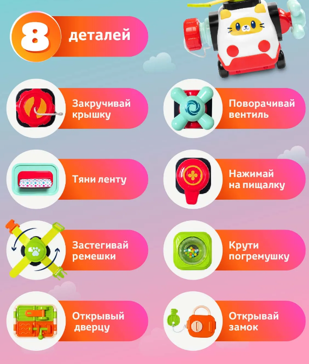 Activitățile includ rotirea, deschiderea, tragerea și înșurubarea pieselor, toate contribuind la stimularea gândirii logice și la învățarea prin joc.