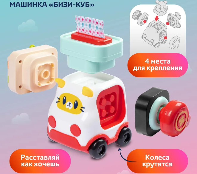 Mașinuța este, de asemenea, un element distractiv, cu roți care se învârt, oferind oportunități nelimitate de joacă creativă.