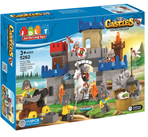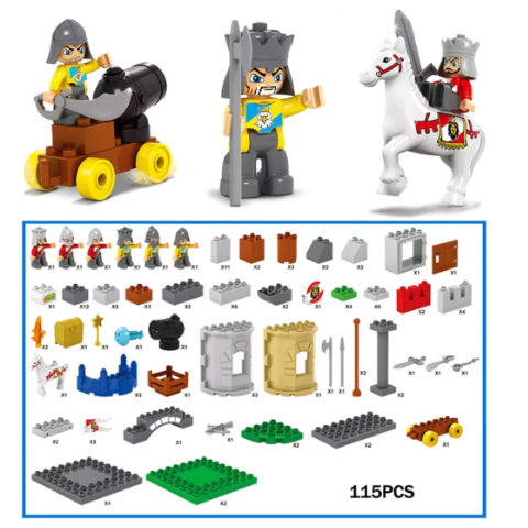 Setul include 115 piese detaliate, de la turnuri și porți masive până la catapulte funcționale care adaugă realism jocului.