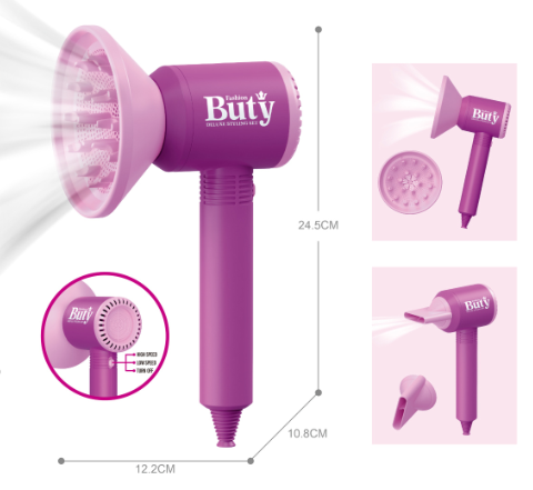Uscătorul de păr este proiectat cu funcții realiste, emite sunet și suflă aer, oferind o experiență autentică și distractivă.