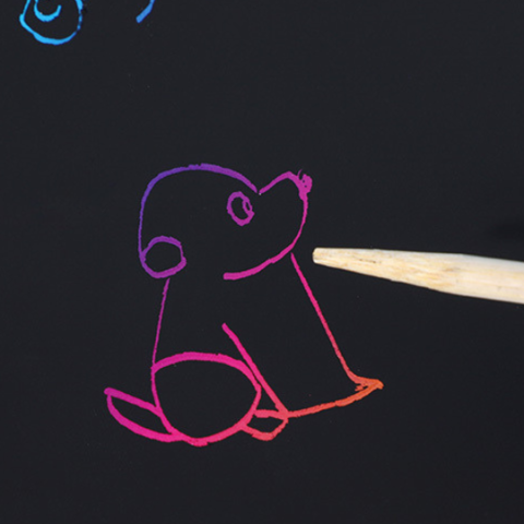 Pe lângă paginile de colorat, setul conține și foi speciale de răzuire, unde cei mici pot descoperi imagini ascunse cu un băț special.