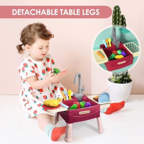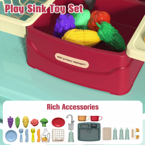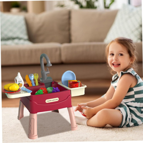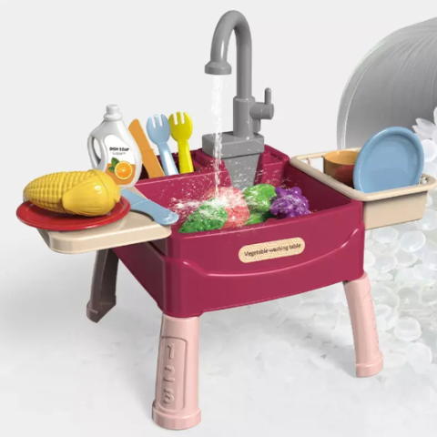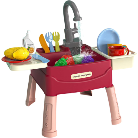 Accesoriile incluse, precum legumele și fructele colorate, îi încurajează pe cei mici să recunoască formele și culorile în timp ce spală și pregătesc „alimentele”.