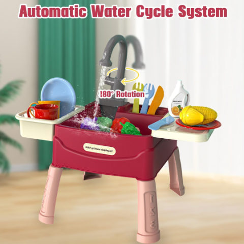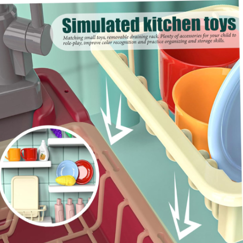 Accesoriile de simulare, precum „detergentul” și scurgătorul detașabil, completează o experiență autentică de spălare a vaselor.