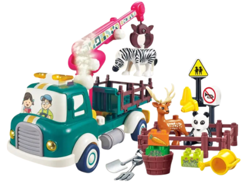 Transformă joaca într-o aventură educativă cu acest camion colorat, echipat cu macara funcțională și un set de animale sălbatice prietenoase.