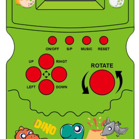 Consola Dino își cucerește micuții utilizatori cu un design vesel și prietenos, decorat cu personaje dinozauri colorate.