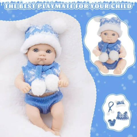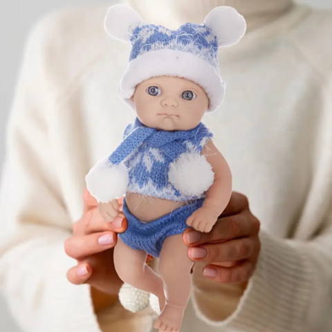 Această păpușă bebeluș realistă de 20 cm cucerește din prima clipă prin privirea sa expresivă și îmbrăcămintea adorabilă, perfectă pentru sezonul rece.