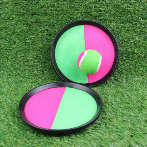 Descoperă bucuria jocului clasic de prindere cu un set modern de discuri velcro și minge colorată, ideal pentru joaca în aer liber sau în casă.