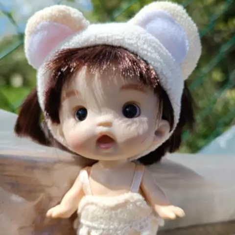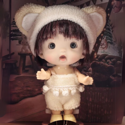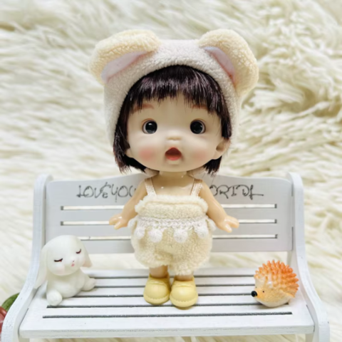 Păpușa poartă o căciuliță cu urechi de ursuleț, confecționată din material moale, care îi accentuează look-ul inocent și drăgălaș.