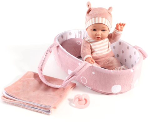 Păpușa vine așezată într-un pătuț portabil, ușor de transportat, căptușit cu un material plăcut la atingere și imprimat cu buline delicate, perfect pentru a fi luat peste tot.