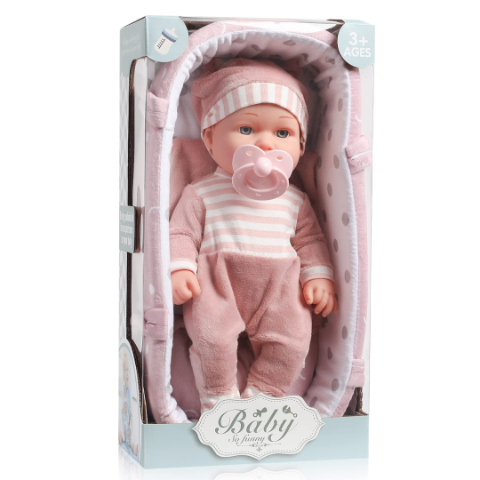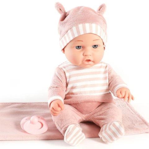 Această adorabilă păpușă bebeluș de 30 cm îi invită pe cei mici într-o lume a grijii și afecțiunii, îmbrăcată într-o salopetă moale, roz pudrat, cu dungi albe, și cu o căciuliță cu urechiușe simpatice.
