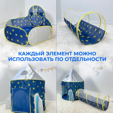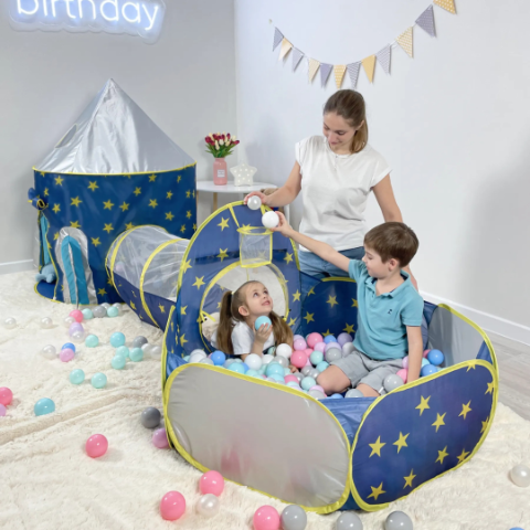 Transformă camera copilului într-un univers magic cu acest set de corturi 3 în 1, compus dintr-un castel spațios, un tunel distractiv și o piscină de bile cu coș de baschet integrat.