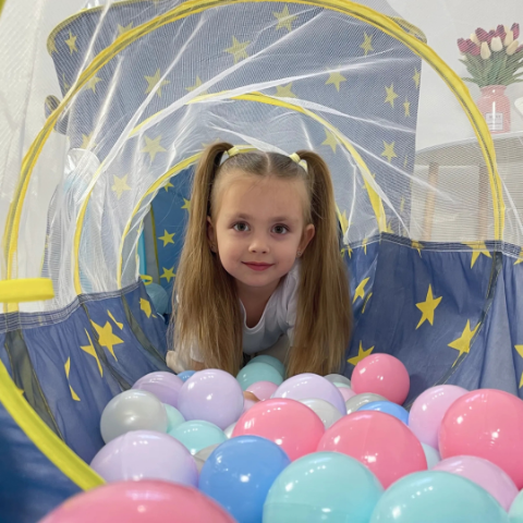 Piscina de bile oferă un spațiu de joacă activ și poate fi folosită și separat, având un inel de baschet pentru aruncarea bilelor.