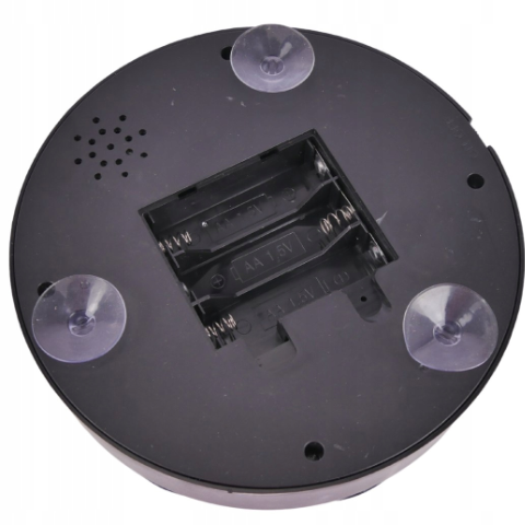 Funcționează cu 3 baterii AA (neincluse) și are ventuze de fixare pentru stabilitate pe orice suprafață.