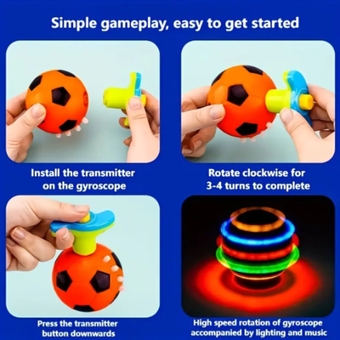 Această jucărie interactivă în formă de minge de fotbal captează atenția instant datorită luminilor LED colorate care se aprind în timpul rotației.