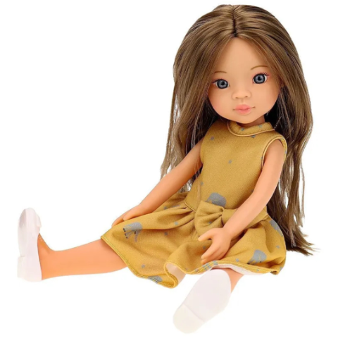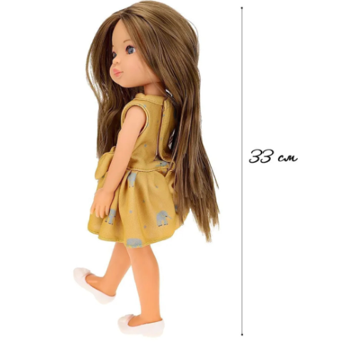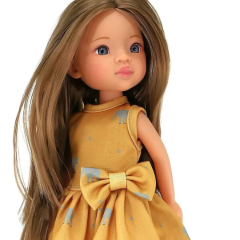 Păpușa Eva impresionează prin părul ei lung, castaniu și rochia galbenă elegantă, accesorizată cu o fundiță fermecătoare.