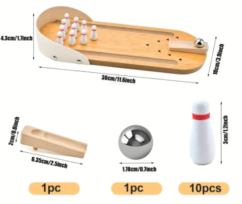 Transformă orice suprafață într-o mini-pistă de bowling cu acest joc compact și elegant, realizat din lemn natural.