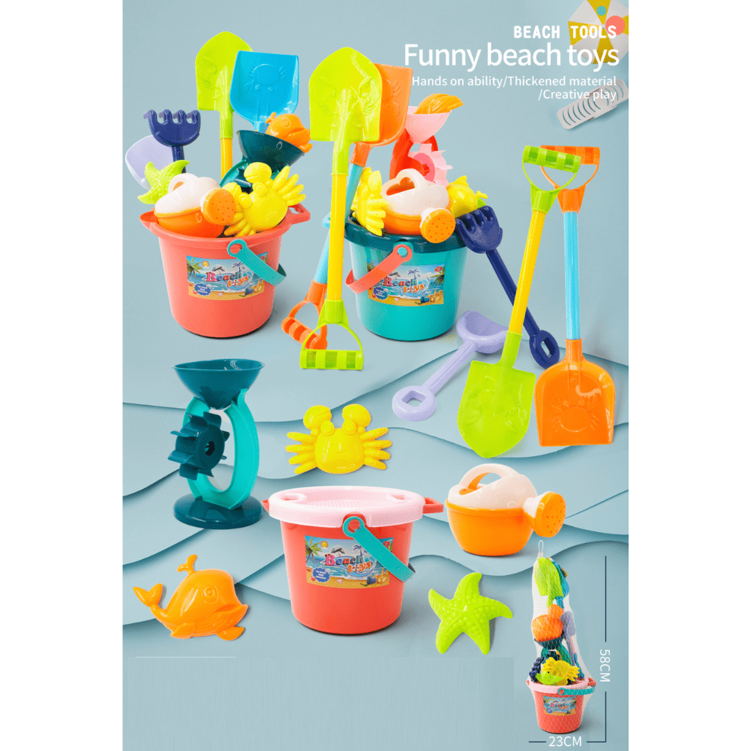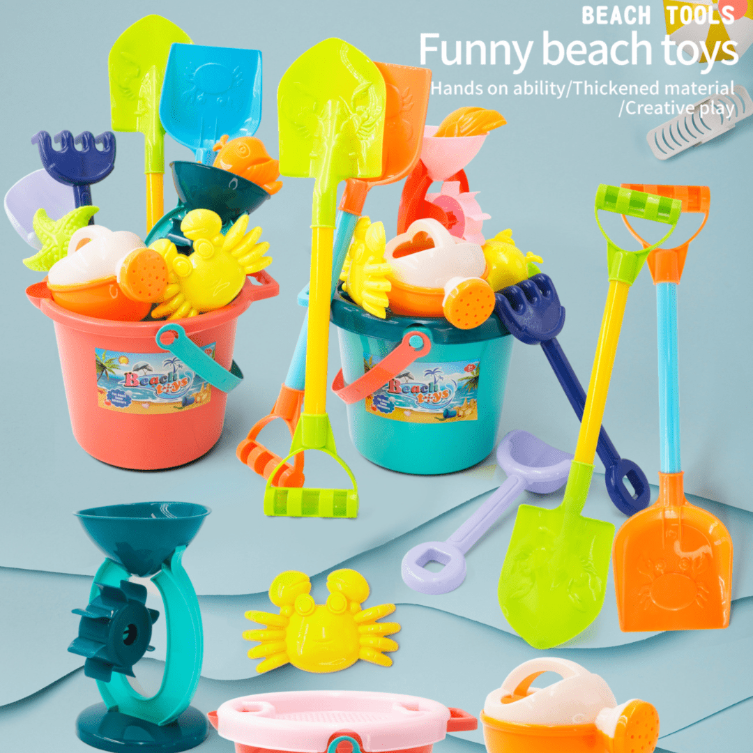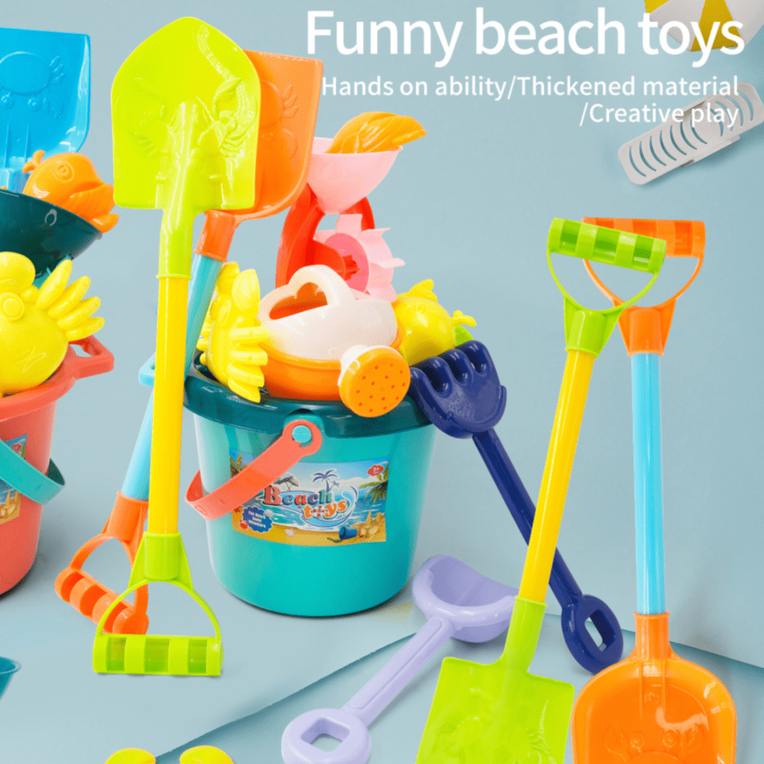 Găletușa colorată este plină de surprize și unelte de joacă esențiale pentru aventuri pe nisip.