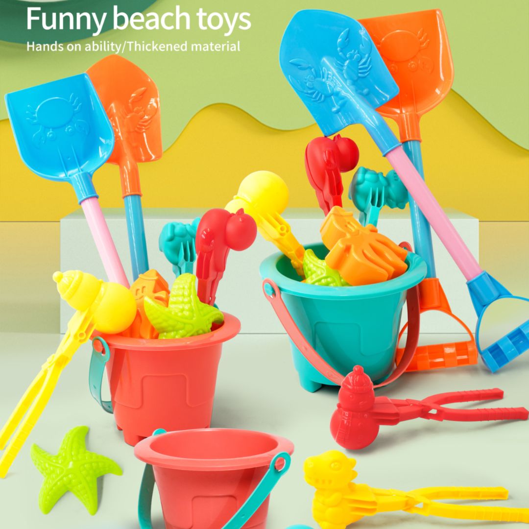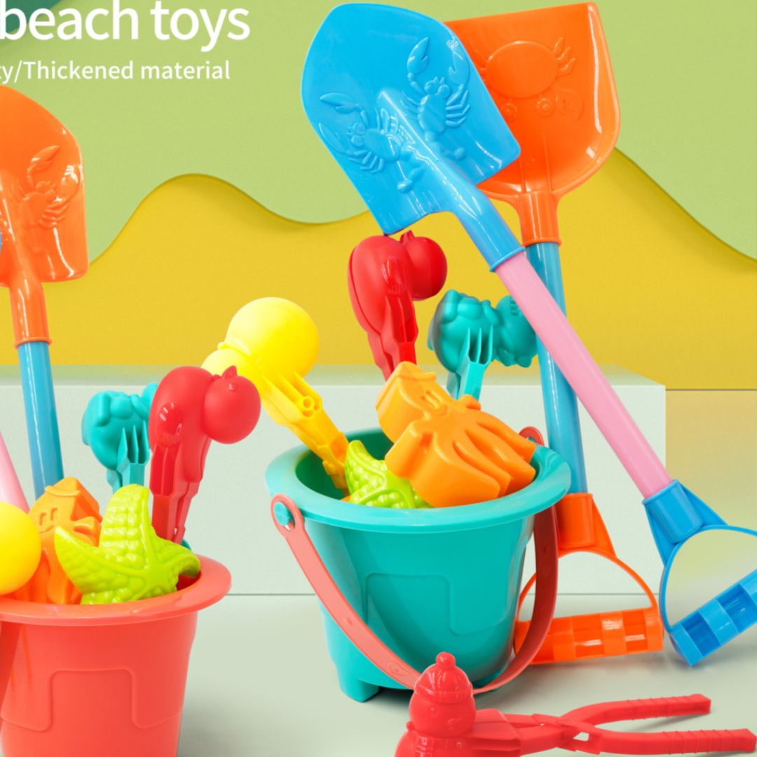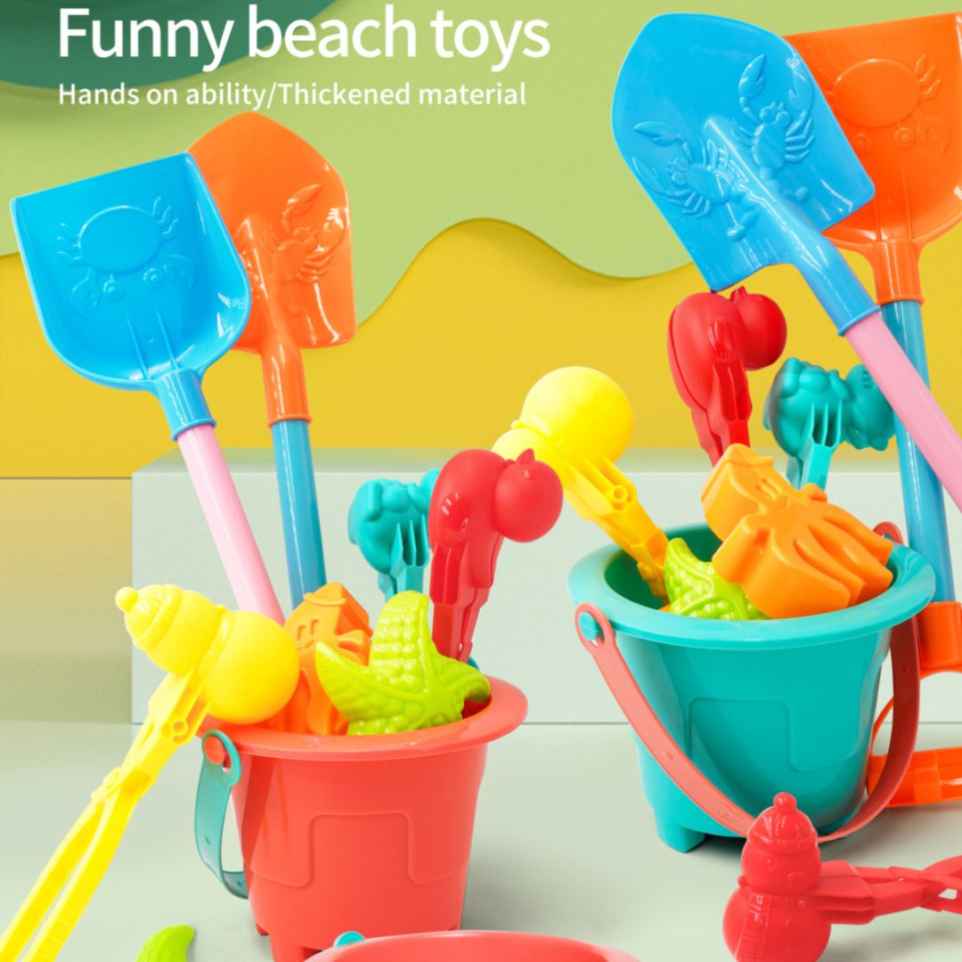 Găletușele viu colorate ascund un set creativ de unelte și forme marine gata de joacă în nisip.