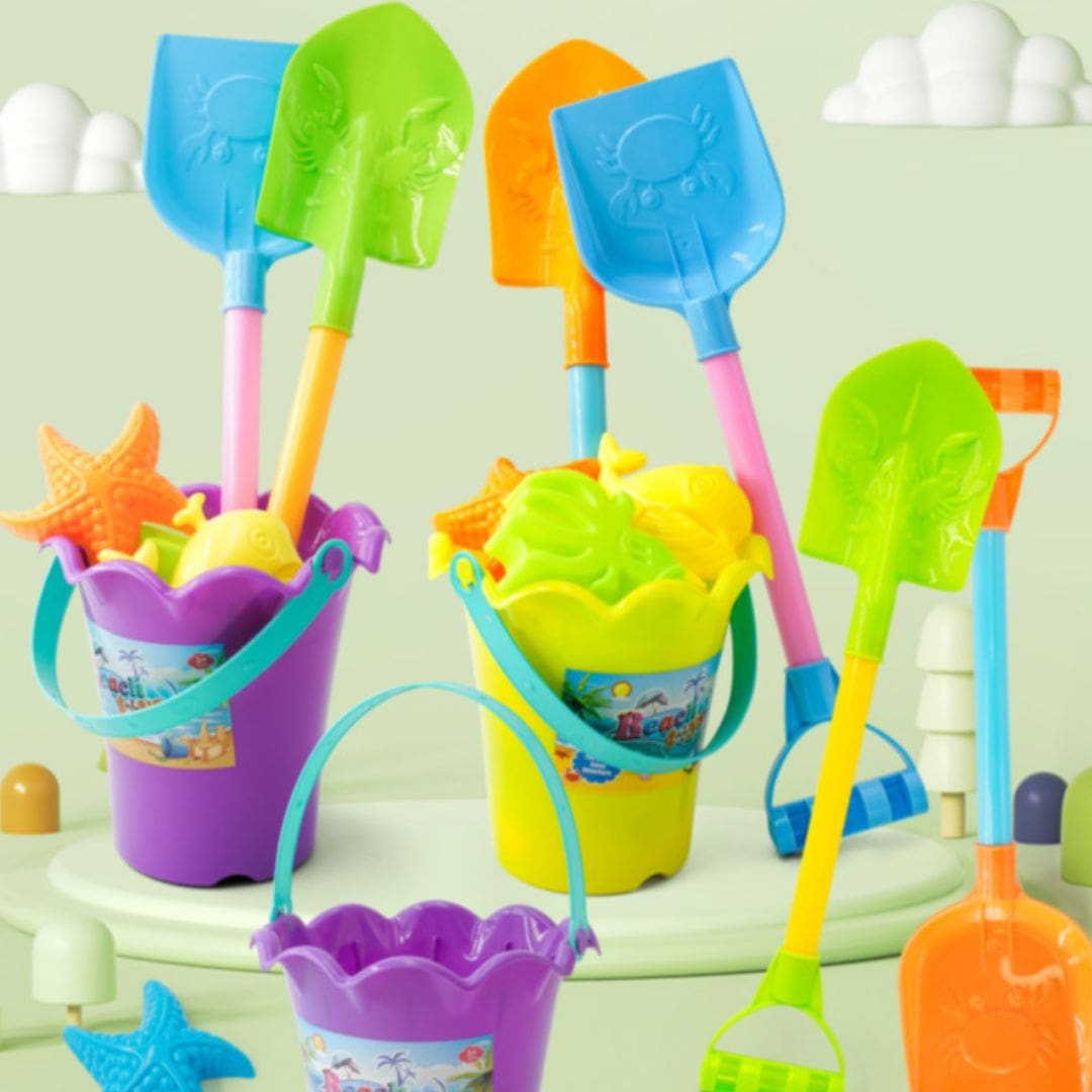Găletușele viu colorate cu margini ondulate sunt pline cu accesorii mari și atractive pentru joaca în nisip.