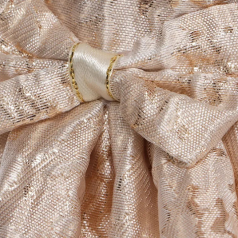 Detaliile de design ale rochiei sunt atent lucrate, cu straturi vaporoase și tivuri aurii care sclipesc discret în lumină.