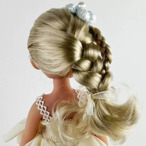 Părul blond, lung și împletit cu grijă, este completat de o fundiță decorativă cu perle ce scoate în evidență coafura sofisticată.