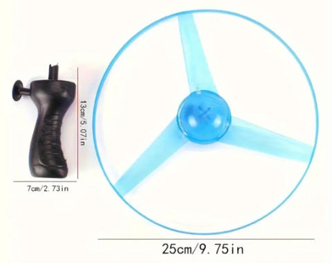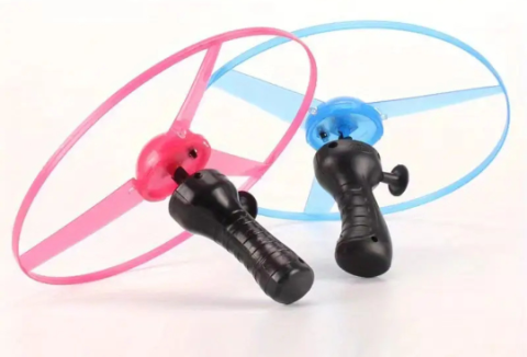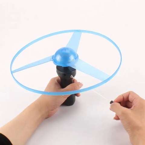 Cu o simplă tragere de fir, farfuria zburătoare prinde viteză și se lansează în aer, oferind copiilor o activitate dinamică în aer liber.