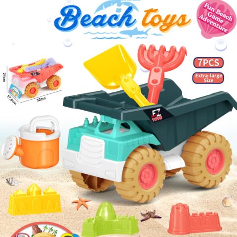 Acest set de plajă cu 7 piese aduce distracția la cote maxime, având ca piesă centrală un camion basculant de mari dimensiuni. Cu o lungime de 32 cm, o lățime de 17,5 cm și o înălțime de 21 cm, camionul este ideal pentru transportul nisipului sau al formelor direct pe șantierul improvizat de copil.