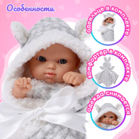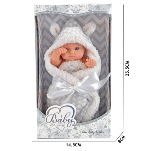 Această păpușă adorabilă de 20 cm este învelită într-o păturică moale cu glugă și urechiușe, oferind o senzație plăcută la atingere, ideală pentru joacă de îngrijire.