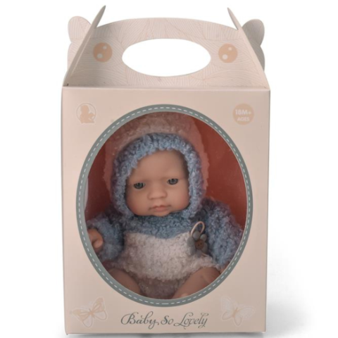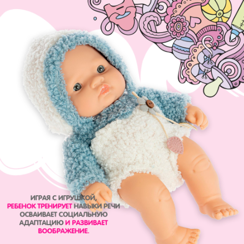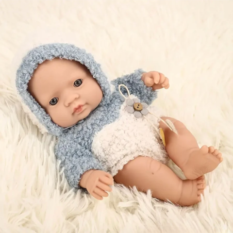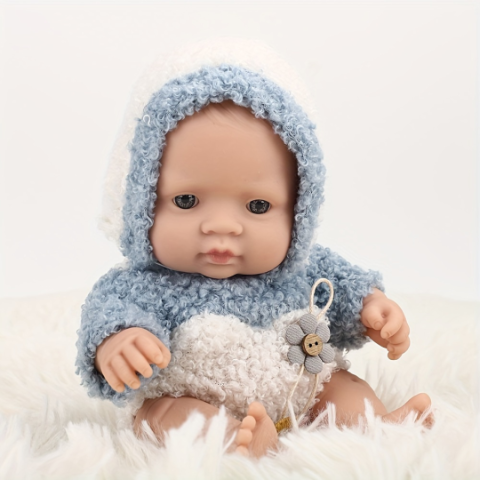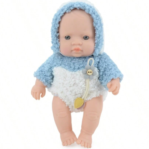Îmbrăcată într-o salopetă pufoasă albastru-deschis cu glugă, jucăria transmite o senzație de căldură și confort.
