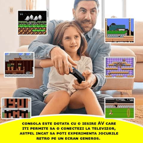 Poți conecta consola la televizor prin cablul AV inclus și trăi din nou magia jocurilor retro pe un ecran mare.