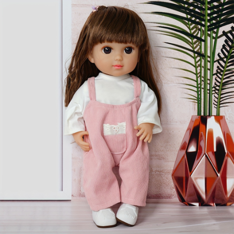Ținuta sa roz, formată dintr-o salopetă adorabilă din catifea reiată și o bluză albă, este cusută cu grijă și oferă o imagine elegantă și prietenoasă.