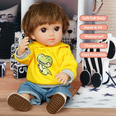Cu un hanorac galben vesel și o față expresivă, păpușa băiețel Chimi captează atenția instant prin naturalețea trăsăturilor și ochii mari, realiști.