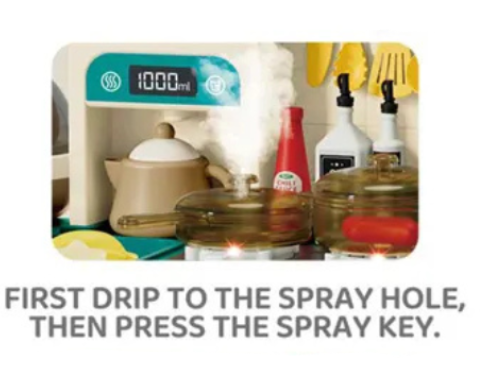 Cuptorul și frigiderul completează acest spațiu de joacă complex, iar aburul, lumina și sunetele îl fac irezistibil.