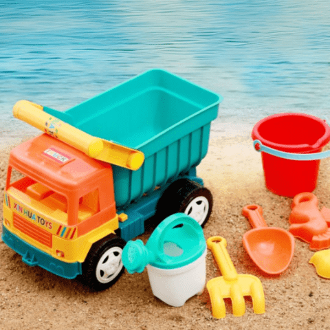 Un camion solid cu benă spațioasă, gata să transporte jucăriile preferate ale copilului tău direct pe plajă.