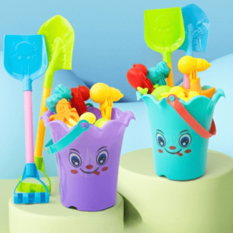 Găletușele zâmbitoare în culori pastel atrag atenția celor mici cu fețele lor vesele și designul prietenos.