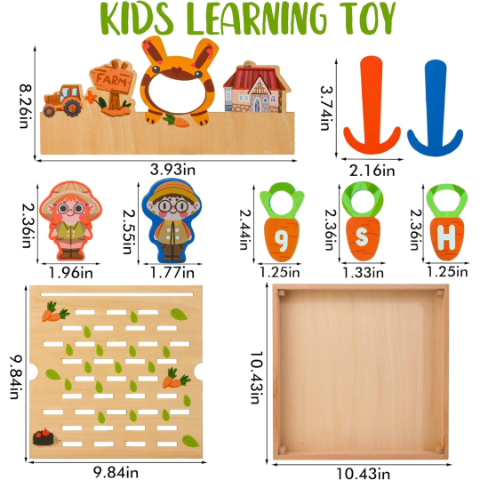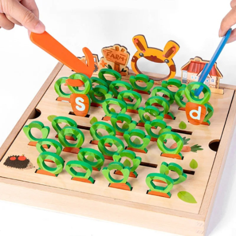 Jocul captivant în formă de fermă invită copiii să culeagă morcovi colorați, fiecare ascunzând o literă sau cifră pe partea inferioară.
