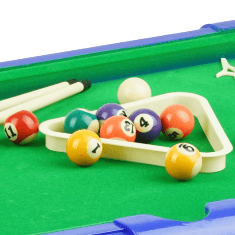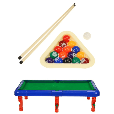 Setul complet include triunghi de aranjare, suporturi și toate accesoriile necesare pentru a începe jocul imediat.