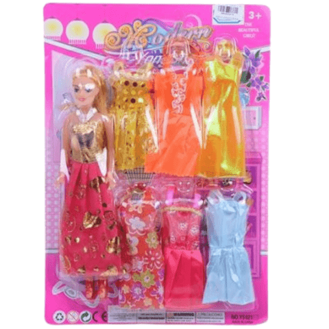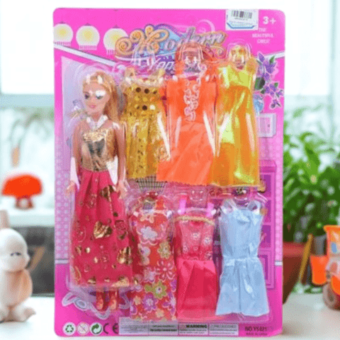 Setul include 6 rochii viu colorate, ce permit fetițelor să schimbe garderoba păpușii în funcție de joc.