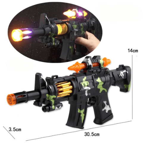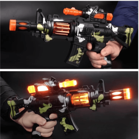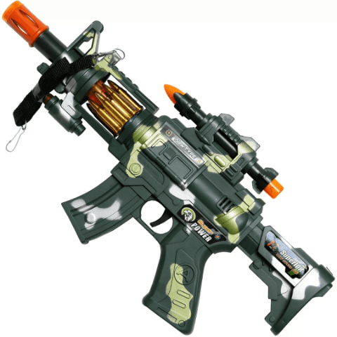 Mitraliera de jucărie are un design realist de camuflaj și tambur rotativ cu cartușe aurii care luminează spectaculos.