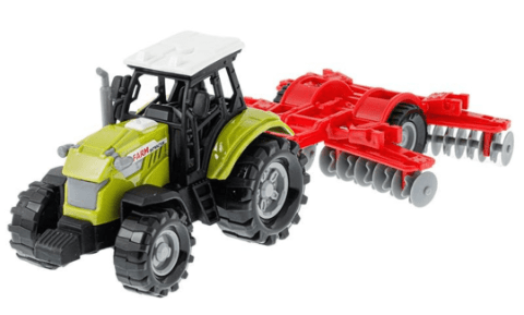 Tractorul verde de fermă cu plug roșu atrage atenția prin design realist și roți mari rezistente.