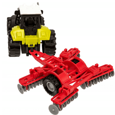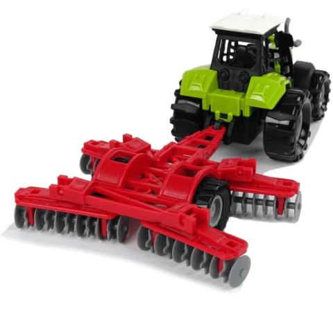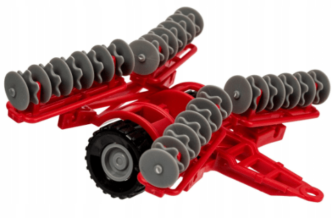 Plugul detaliat cu discuri rotative roșii reproduce fidel unelte agricole adevărate.