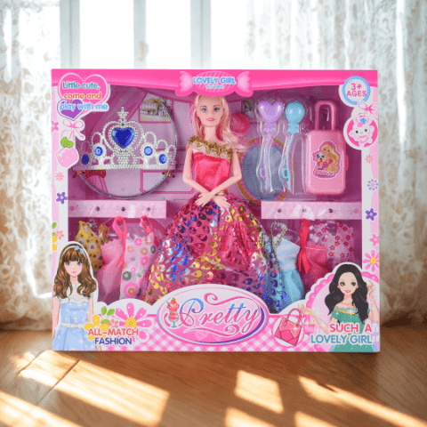 Păpușa este prezentată într-o cutie mare, cu un design atractiv, care scoate în evidență rochia elegantă și accesoriile incluse.
