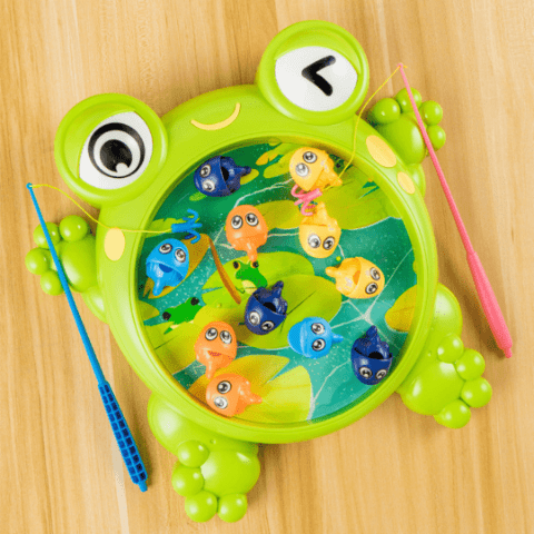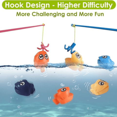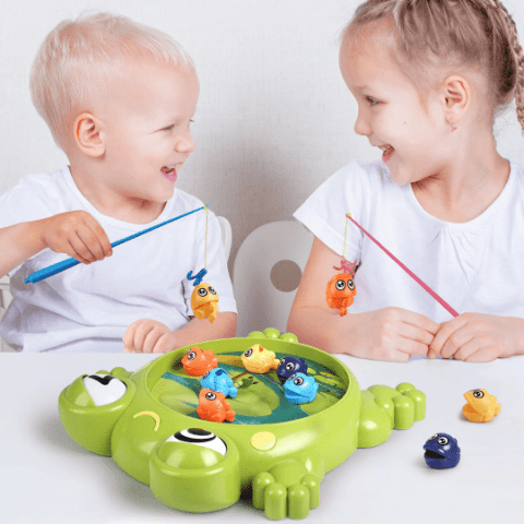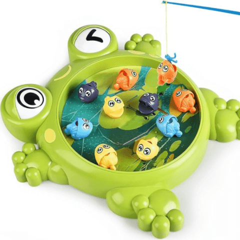 Jocul de pescuit cu design de broască veselă atrage atenția copiilor prin culorile vii și forma prietenoasă.