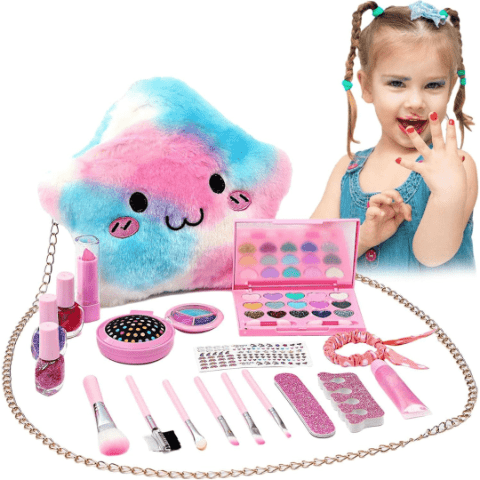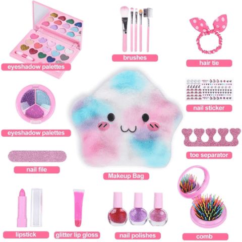 Acest set de machiaj pentru copii vine într-o geantă pufoasă în formă de stea, cu culori pastelate atractive, perfectă pentru depozitare și transport.