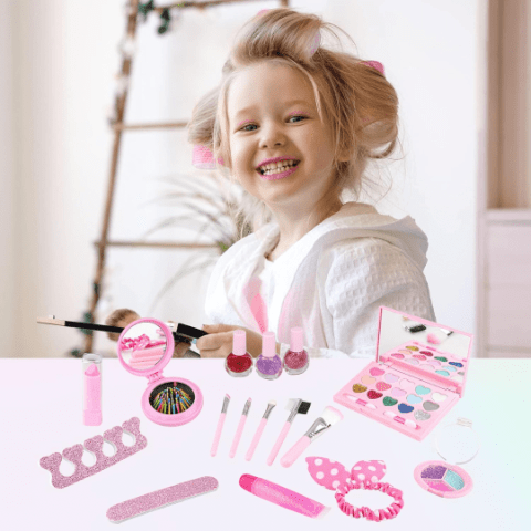 Setul conține pensule de machiaj și accesorii variate, dezvoltând îndemânarea și coordonarea celor mici.