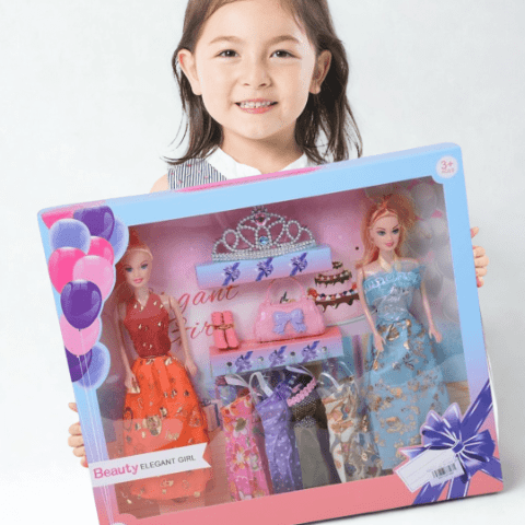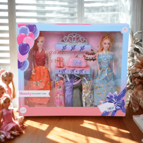 Setul conține două păpuși elegante de aproximativ 30 cm, îmbrăcate în rochii colorate cu imprimeuri strălucitoare.