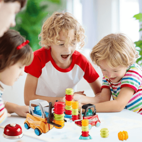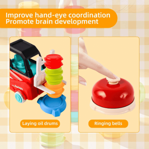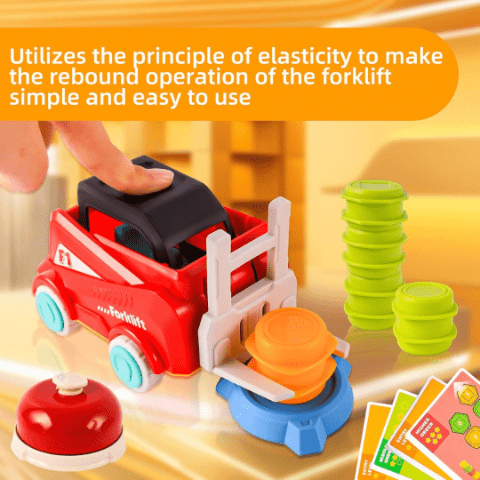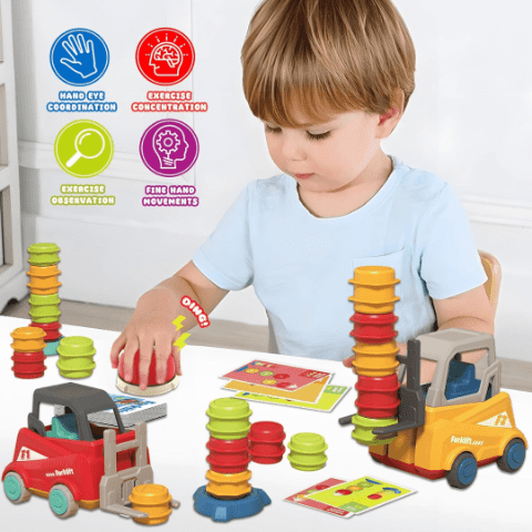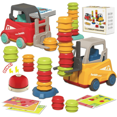 Două stivuitoare permit joc în echipă sau duel cronometrat, încurajând cooperarea și strategia.
