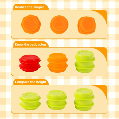 Cilindrii colorați în roșu, portocaliu și verde se stivuiesc stabil, antrenând dexteritatea.
